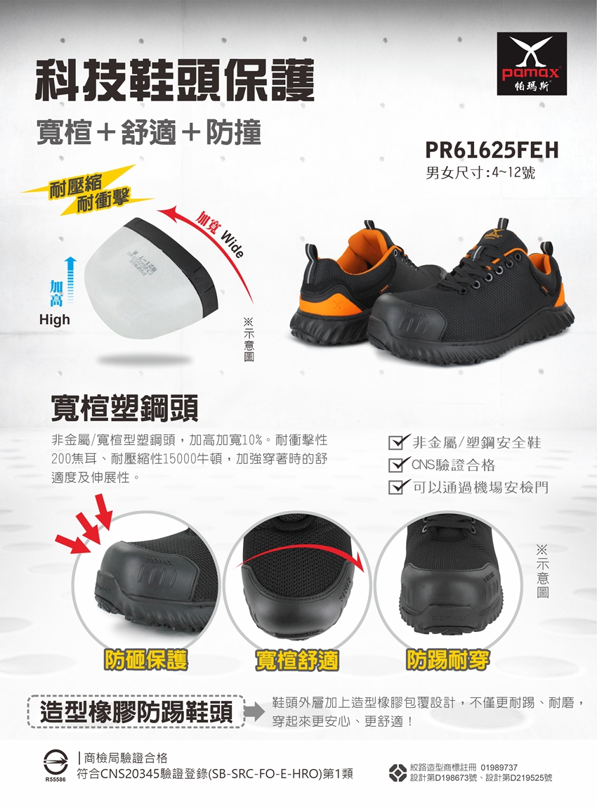 產品簡述: ★寬楦塑鋼頭。★透氣織物鞋面。★全雙無金屬。★內嵌全雙高彈力機能墊。★銀纖維抗菌除臭,乳膠半墊。通過多項CNS國家附加功能認證:SRC防滑等級、FO耐燃油性、E鞋跟部能量吸收性、HRO耐熱接觸等。★造型橡膠防踢鞋頭,防踢耐穿。★專利橡膠防滑紋路,具高抓地力,耐油,耐磨損,耐酸鹼,耐高溫等...特性。★ 原產地 : 臺灣。★商品嚴選,請充分了解商品特性,多一分認識多一分安全保障。★此工作安全鞋【通過經濟部標準檢驗局驗證登錄】依據標準【CNS20345:2015】,依法取得合格證書及合法銷售,可以放心購買。