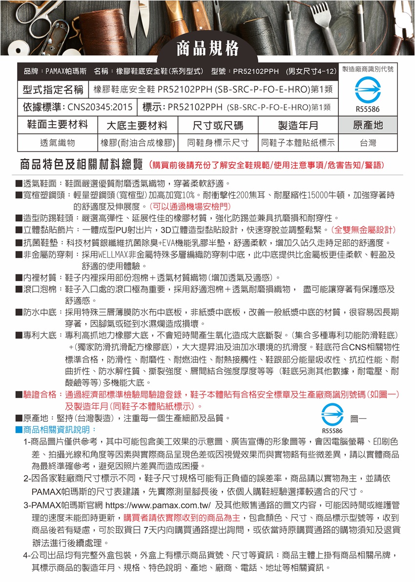 | 商品規格: | 【安全鞋依據標準:CNS20345:2015】型式指定名稱:橡膠鞋底安全鞋PR52102PPH(SB-SRC-P-FO-E-HRO)第1類 (購買前請確實了解安全鞋附加功能代號)。(代號說明)【 購買前後及使用前請充分了解, 使用說明/注意事項/危害告知/警語】請內詳 男女尺寸4-12 |
