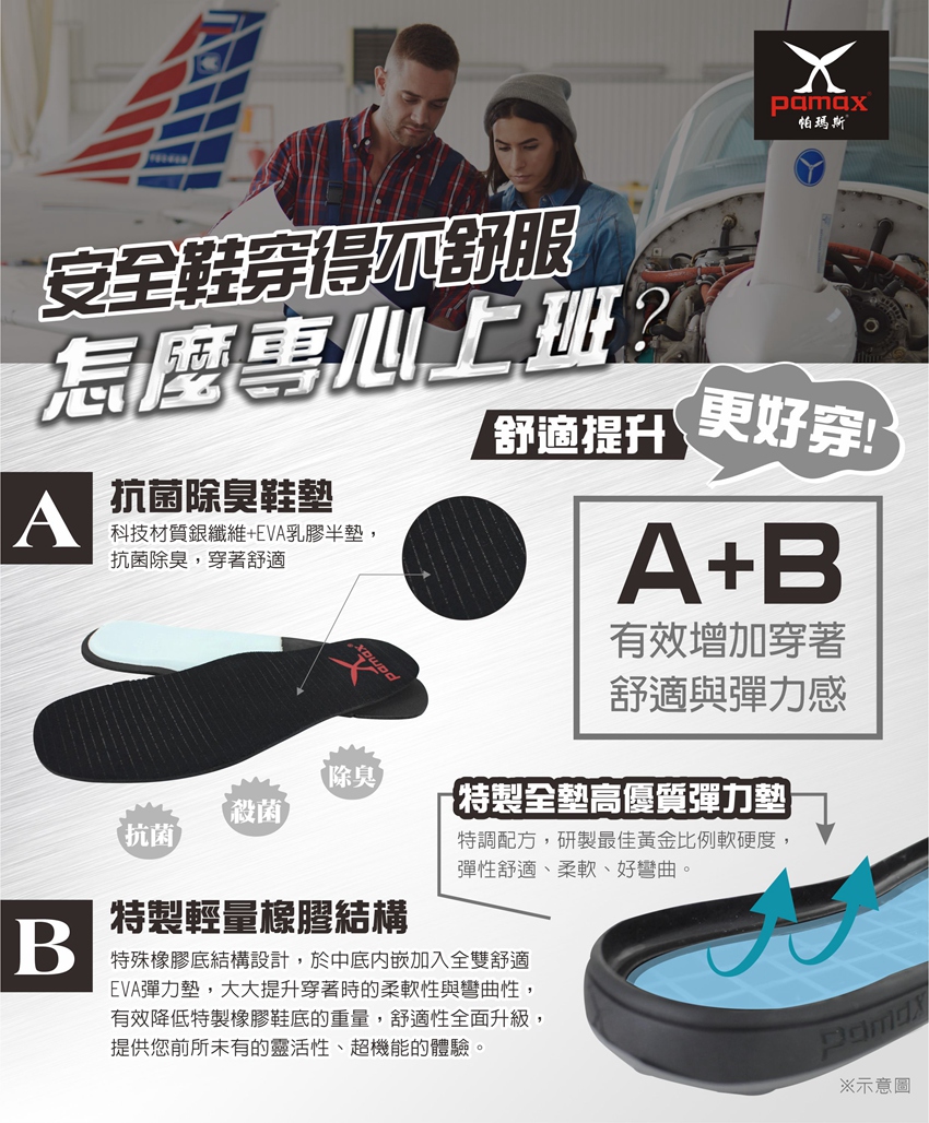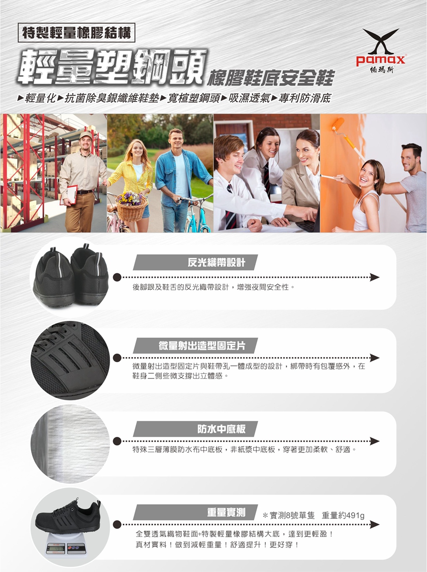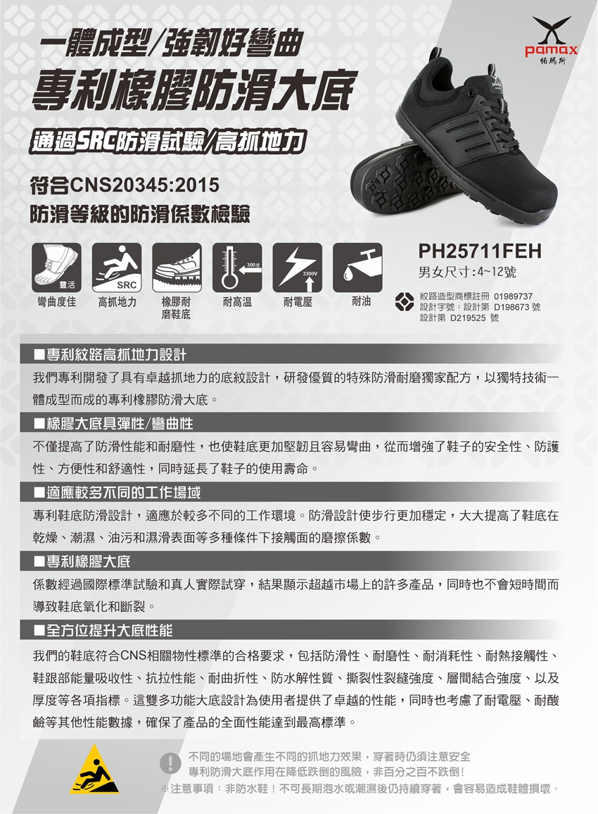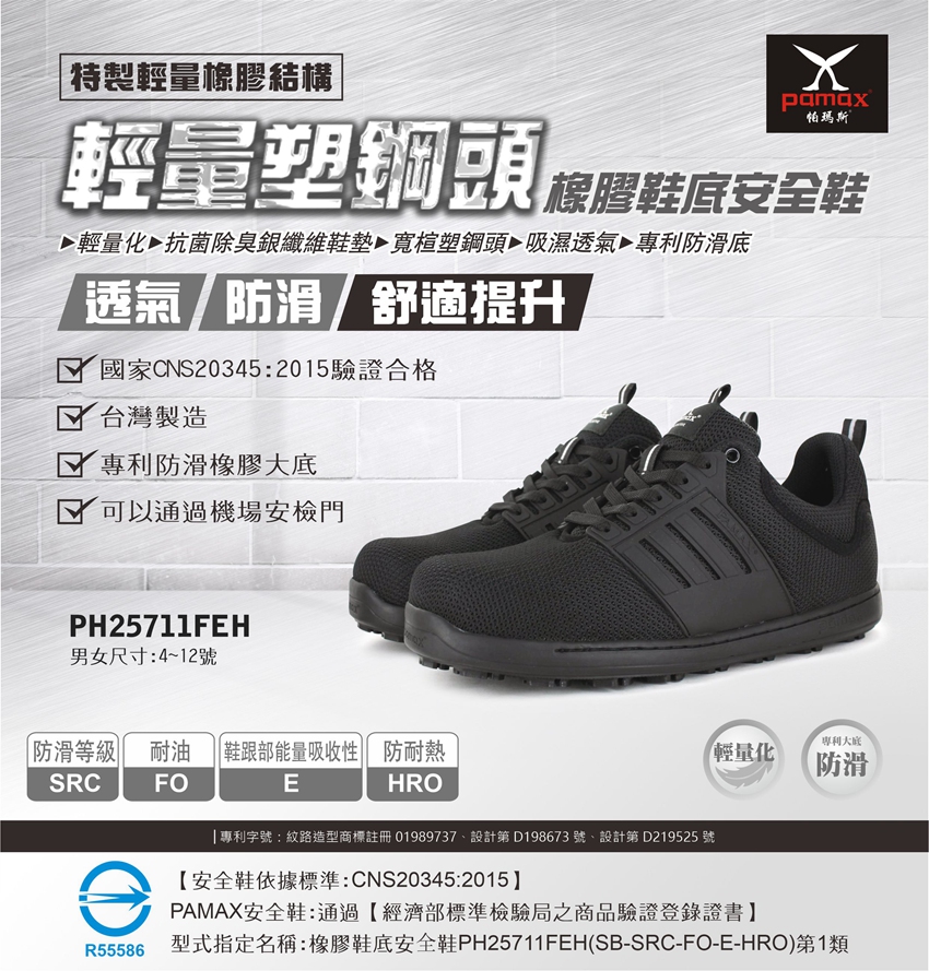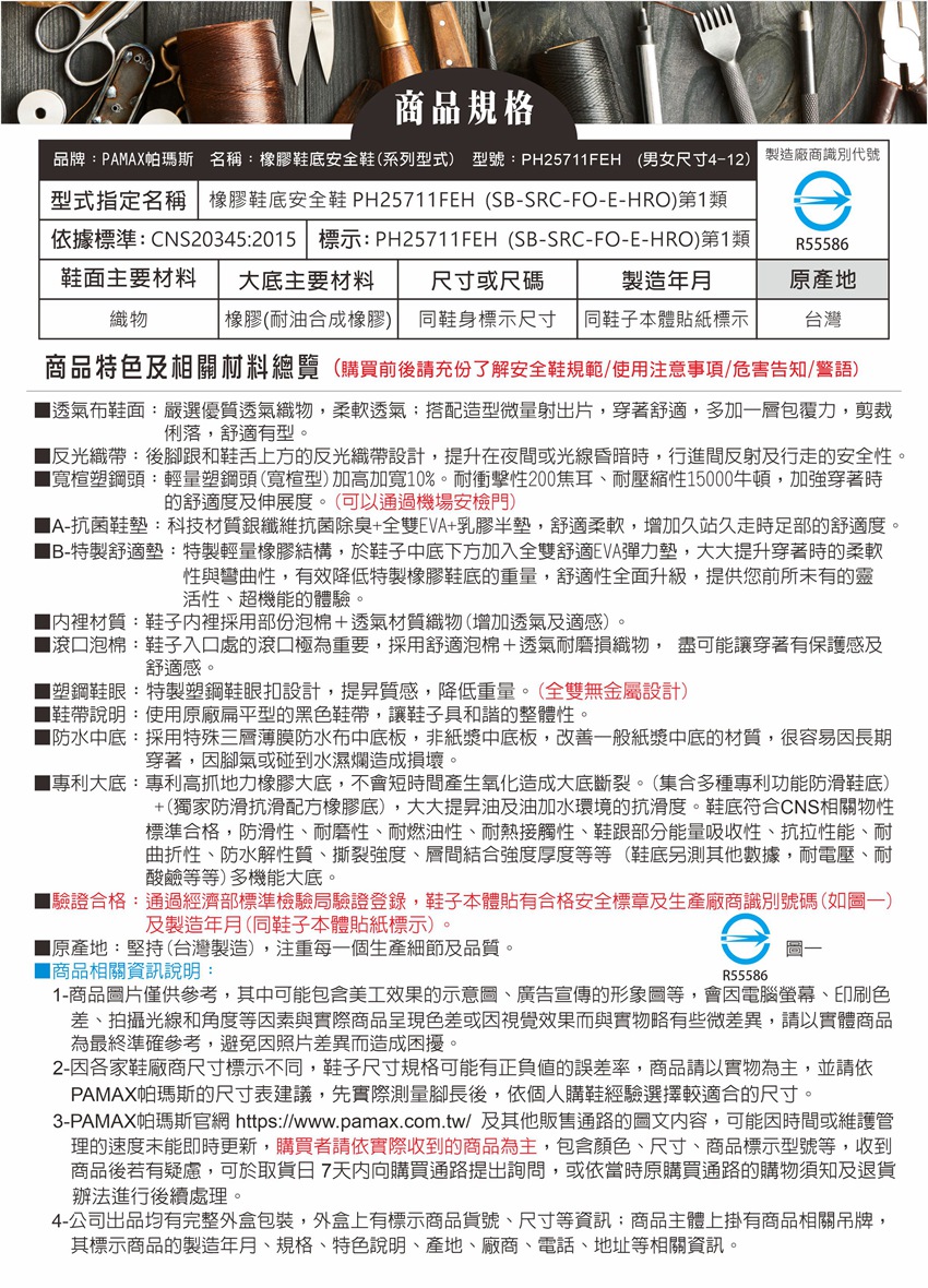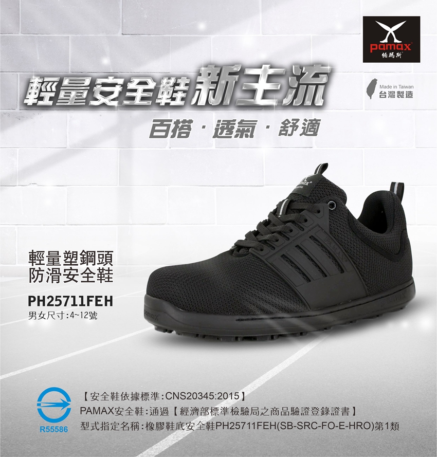 此工作安全鞋【通過經濟部標準檢驗局驗證登錄】依據標準【CNS20345:2015】,依法取得合格證書及合法銷售 購買PAMAX安全鞋依實際鞋子為主:PAMAX帕瑪斯官網https://www.pamax.com.tw/,網站圖片及資料或其他通路販售的資料,可能因時間及維護管理未能即時更新,購買者請依實際收到的安全鞋或鞋類為主,包含鞋子顏色,尺寸,商品標示,製造日期,鞋盒包裝,商品說明,產地,廠商,電話,地址,相關吊牌,依取得當時為主,請確認是否正確,收到商品後若有疑慮,可於取貨日7天内向購買通路提出詢問,或依當時原購買通路的購物須知及退貨辦法進行。