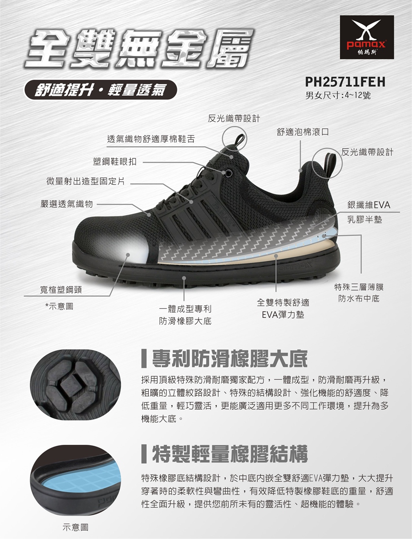 【 購買前後及使用前請充分了解, 使用說明/注意事項/危害告知/警語】點選網址進入 https://www.pamax.com.tw/news.php?act=view&id=3 使用說明 (1)鞋面材或外底顯著損傷之安全鞋,應立即更換。