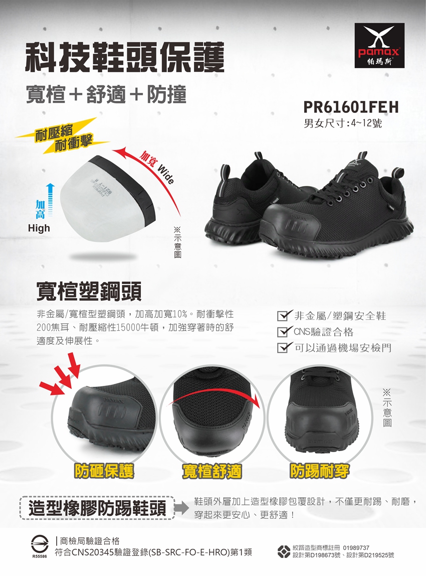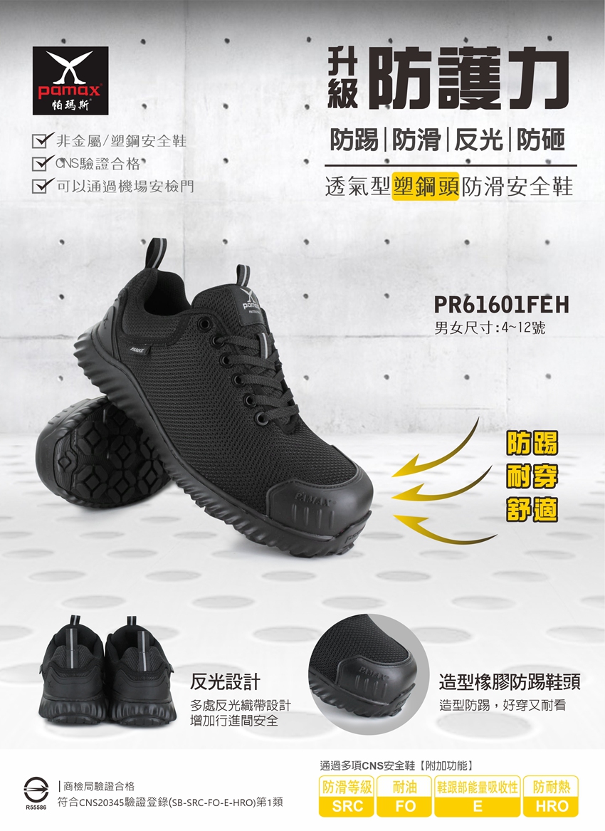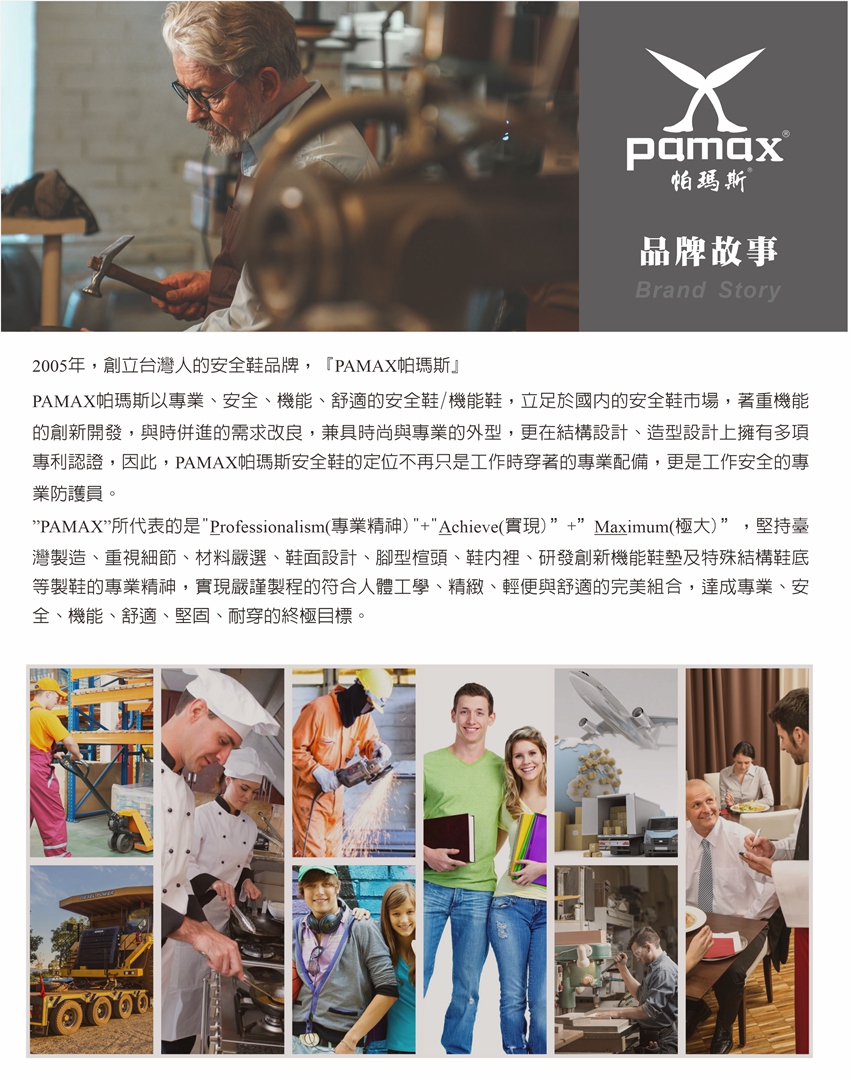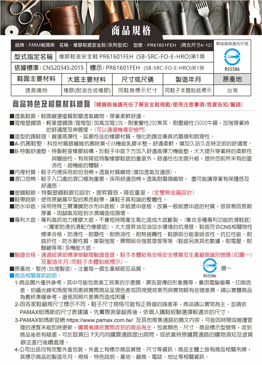 此工作安全鞋【通過經濟部標準檢驗局驗證登錄】依據標準【CNS20345:2015】,依法取得合格證書及合法銷售 購買PAMAX安全鞋依實際鞋子為主:PAMAX帕瑪斯官網https://www.pamax.com.tw/,網站圖片及資料或其他通路販售的資料,可能因時間及維護管理未能即時更新,購買者請依實際收到的安全鞋或鞋類為主,包含鞋子顏色,尺寸,商品標示,製造日期,鞋盒包裝,商品說明,產地,廠商,電話,地址,相關吊牌,依取得當時為主,請確認是否正確,收到商品後若有疑慮,可於取貨日7天内向購買通路提出詢問,或依當時原購買通路的購物須知及退貨辦法進行。