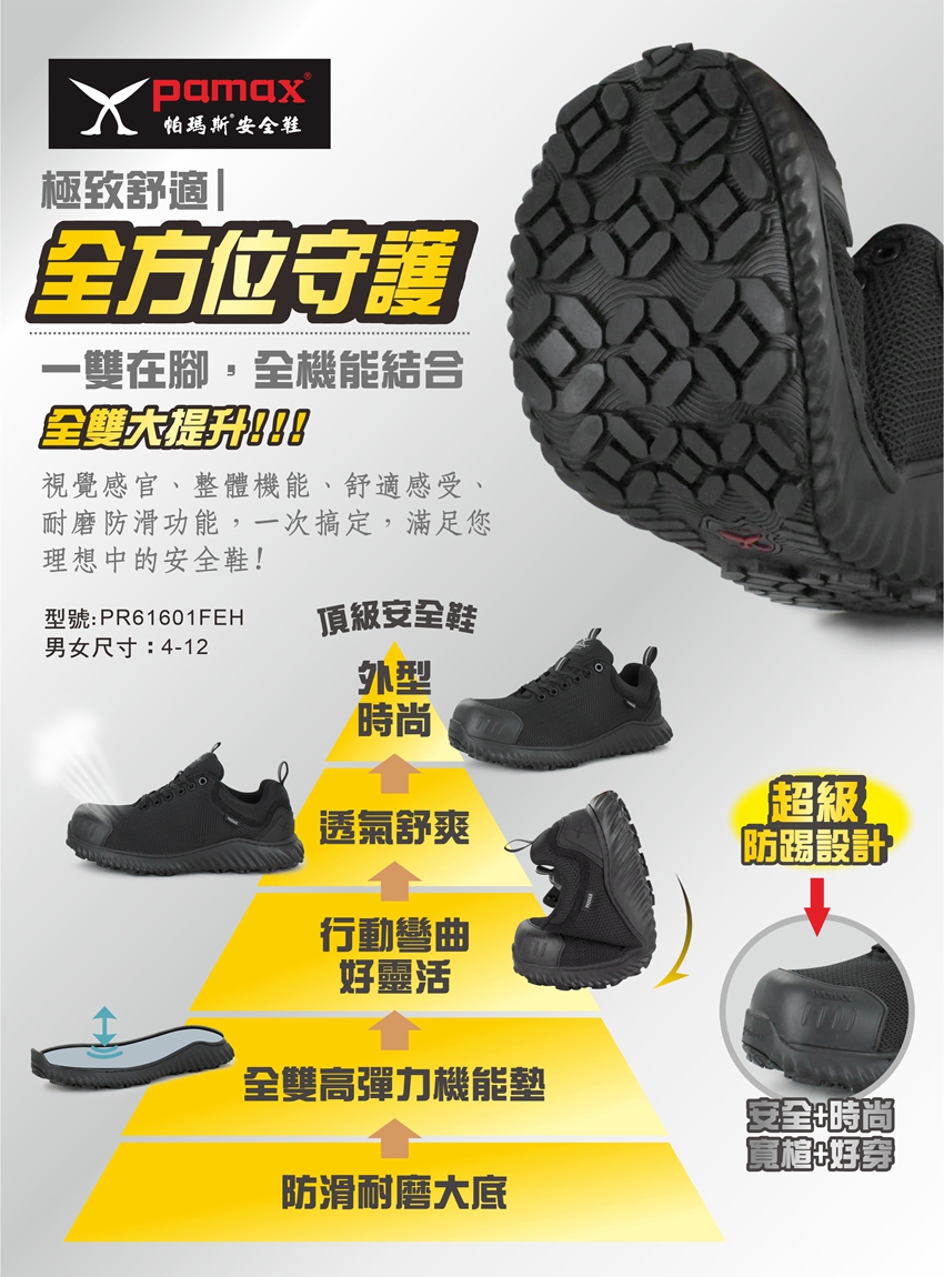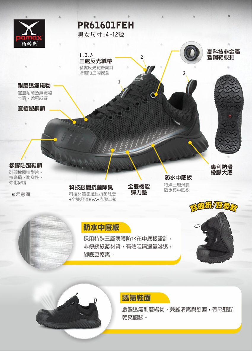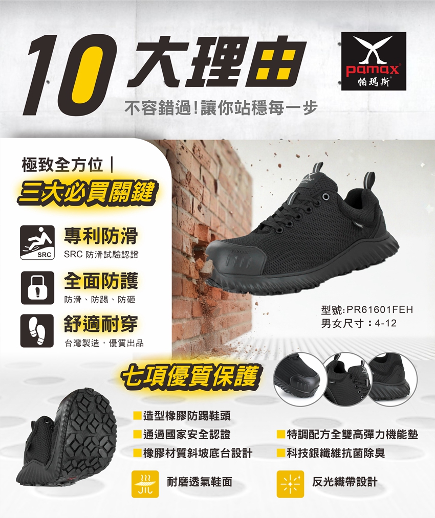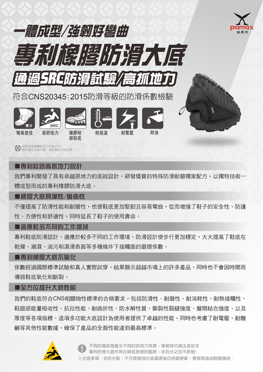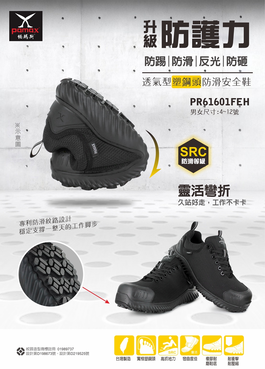 此工作安全鞋【通過經濟部標準檢驗局驗證登錄】依據標準【CNS20345:2015】,依法取得合格證書及合法銷售 購買PAMAX安全鞋依實際鞋子為主:PAMAX帕瑪斯官網https://www.pamax.com.tw/,網站圖片及資料或其他通路販售的資料,可能因時間及維護管理未能即時更新,購買者請依實際收到的安全鞋或鞋類為主,包含鞋子顏色,尺寸,商品標示,製造日期,鞋盒包裝,商品說明,產地,廠商,電話,地址,相關吊牌,依取得當時為主,請確認是否正確,收到商品後若有疑慮,可於取貨日7天内向購買通路提出詢問,或依當時原購買通路的購物須知及退貨辦法進行。