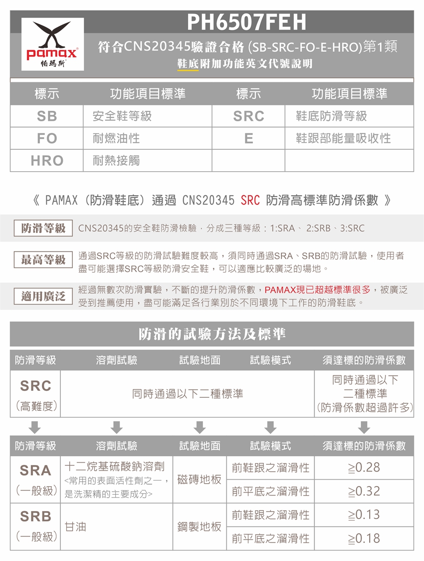 商品規格:【安全鞋依據標準:CNS20345:2015】型式指定名稱:橡膠鞋底安鞋PH6507FEH(SB-SRC-FO-E-HRO)第1類
