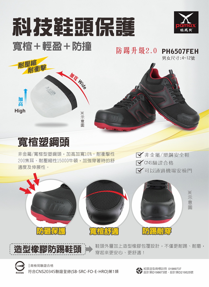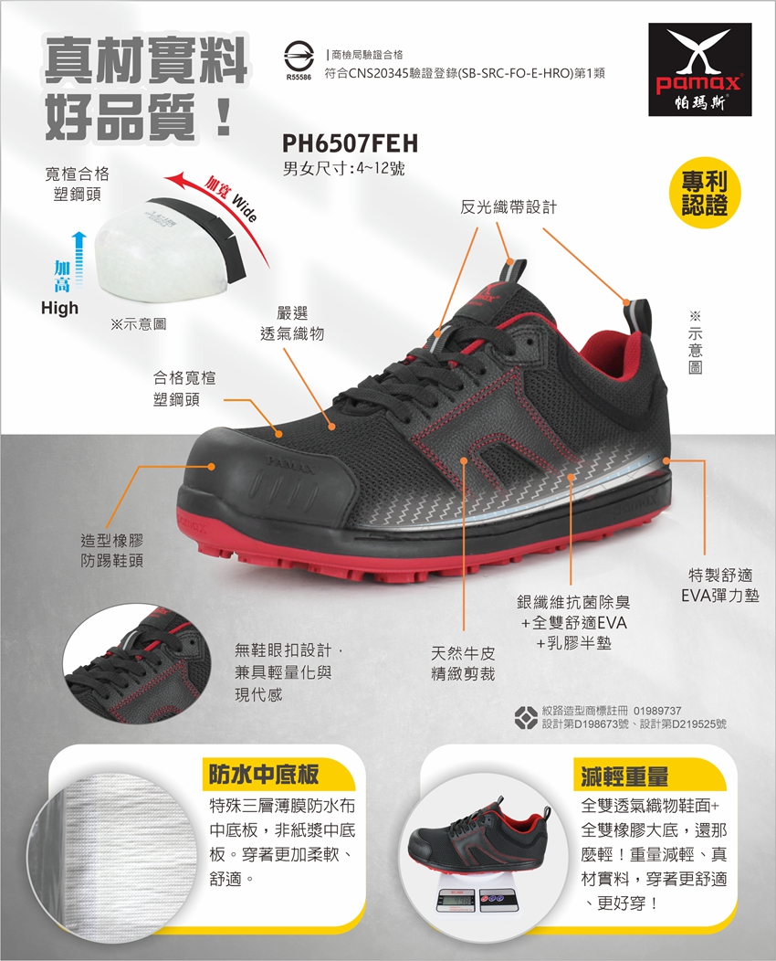 產品簡述: ★寬楦塑鋼頭。★透氣織物鞋面。★全雙無金屬。★內嵌全雙高彈力機能墊。★銀纖維抗菌除臭,乳膠半墊。通過多項CNS國家附加功能認證:SRC防滑等級、FO耐燃油性、E鞋跟部能量吸收性、HRO耐熱接觸等。★造型橡膠防踢鞋頭,防踢耐穿。★專利橡膠防滑紋路,具高抓地力,耐油,耐磨損,耐酸鹼,耐高溫等...特性。★ 原產地 : 臺灣。★商品嚴選,請充分了解商品特性,多一分認識多一分安全保障。★此工作安全鞋【通過經濟部標準檢驗局驗證登錄】依據標準【CNS20345:2015】,依法取得合格證書及合法銷售,可以放心購買。