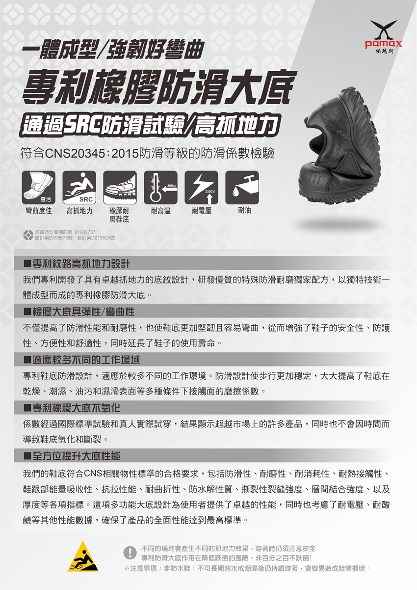 此工作安全鞋【通過經濟部標準檢驗局驗證登錄】依據標準【CNS20345:2015】,依法取得合格證書及合法銷售 購買PAMAX安全鞋依實際鞋子為主:PAMAX帕瑪斯官網https://www.pamax.com.tw/,網站圖片及資料或其他通路販售的資料,可能因時間及維護管理未能即時更新,購買者請依實際收到的安全鞋或鞋類為主,包含鞋子顏色,尺寸,商品標示,製造日期,鞋盒包裝,商品說明,產地,廠商,電話,地址,相關吊牌,依取得當時為主,請確認是否正確,收到商品後若有疑慮,可於取貨日7天内向購買通路提出詢問,或依當時原購買通路的購物須知及退貨辦法進行。