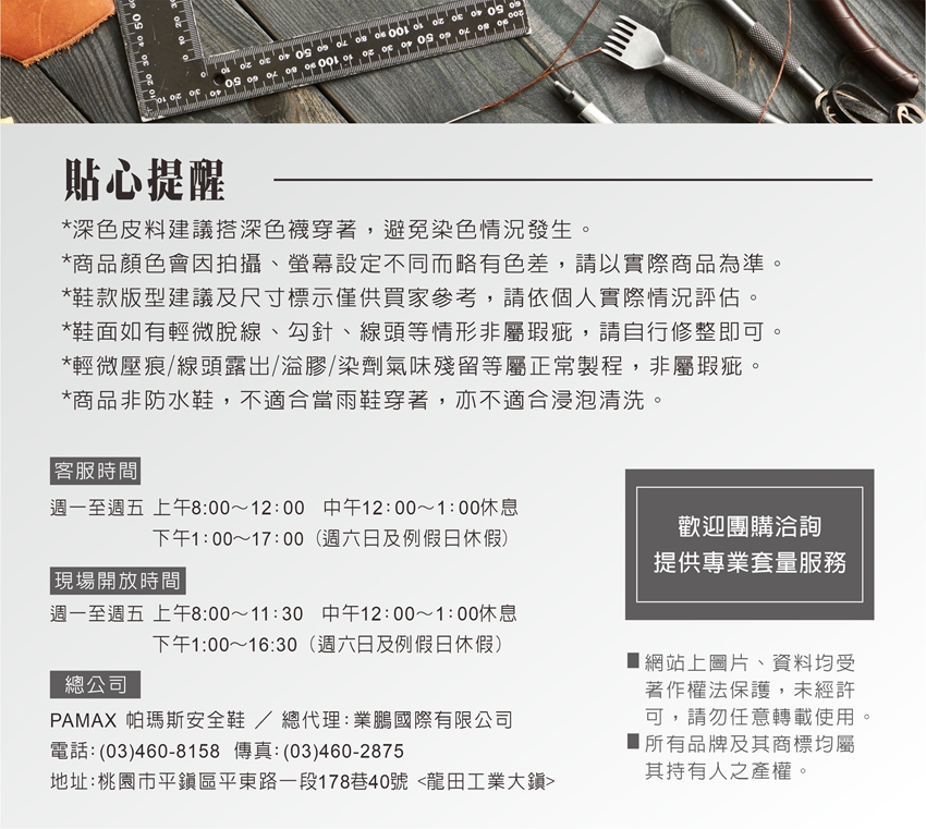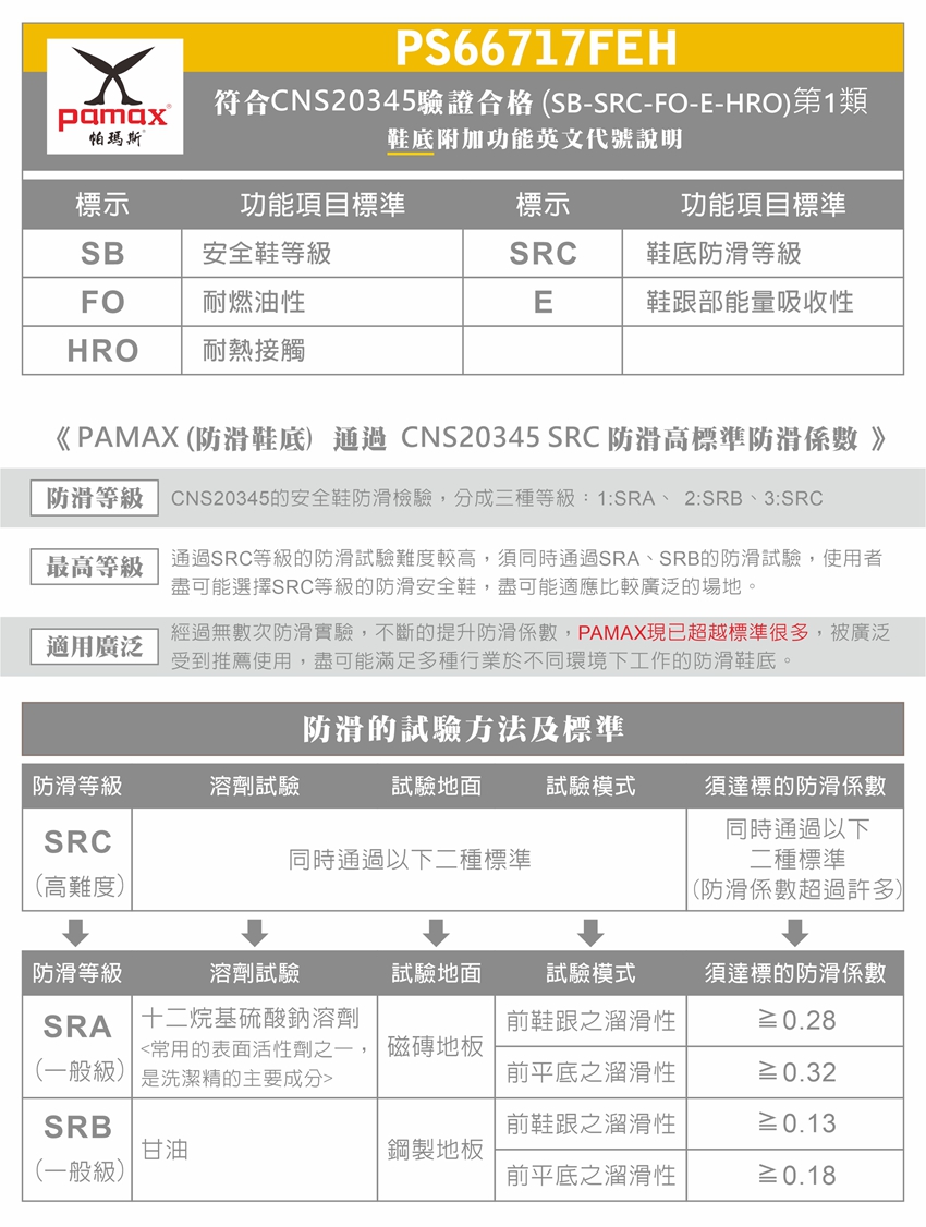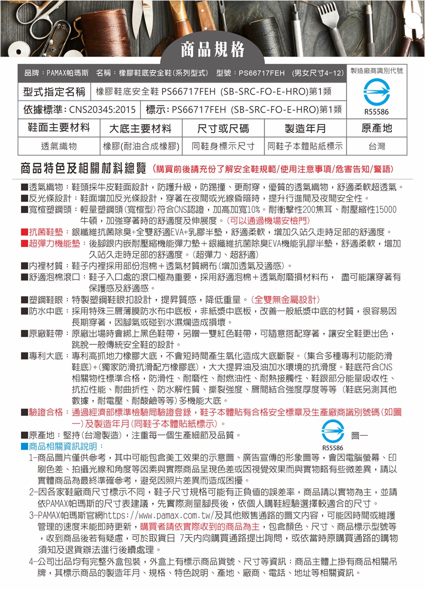 此工作安全鞋【通過經濟部標準檢驗局驗證登錄】依據標準【CNS20345:2015】,依法取得合格證書及合法銷售 購買PAMAX安全鞋依實際鞋子為主:PAMAX帕瑪斯官網https://www.pamax.com.tw/,網站圖片及資料或其他通路販售的資料,可能因時間及維護管理未能即時更新,購買者請依實際收到的安全鞋或鞋類為主,包含鞋子顏色,尺寸,商品標示,製造日期,鞋盒包裝,商品說明,產地,廠商,電話,地址,相關吊牌,依取得當時為主,請確認是否正確,收到商品後若有疑慮,可於取貨日7天内向購買通路提出詢問,或依當時原購買通路的購物須知及退貨辦法進行。