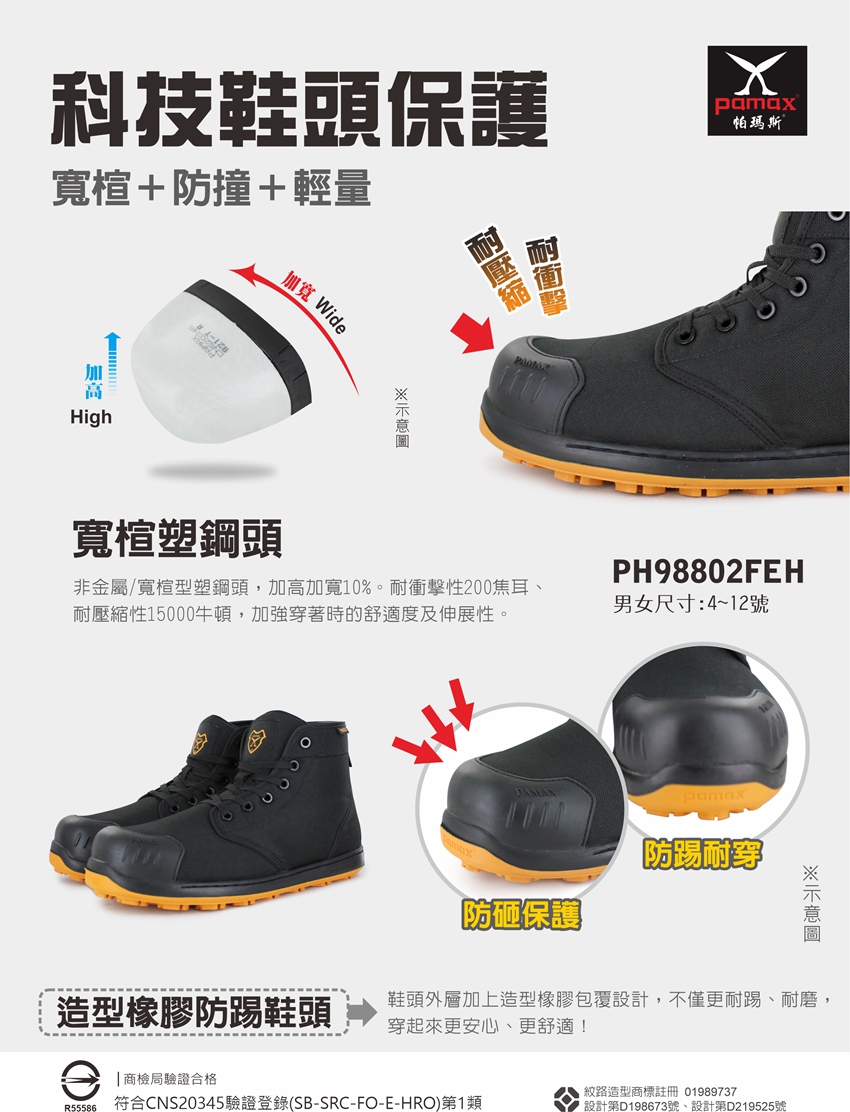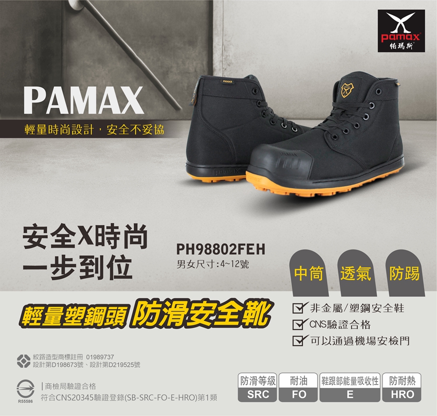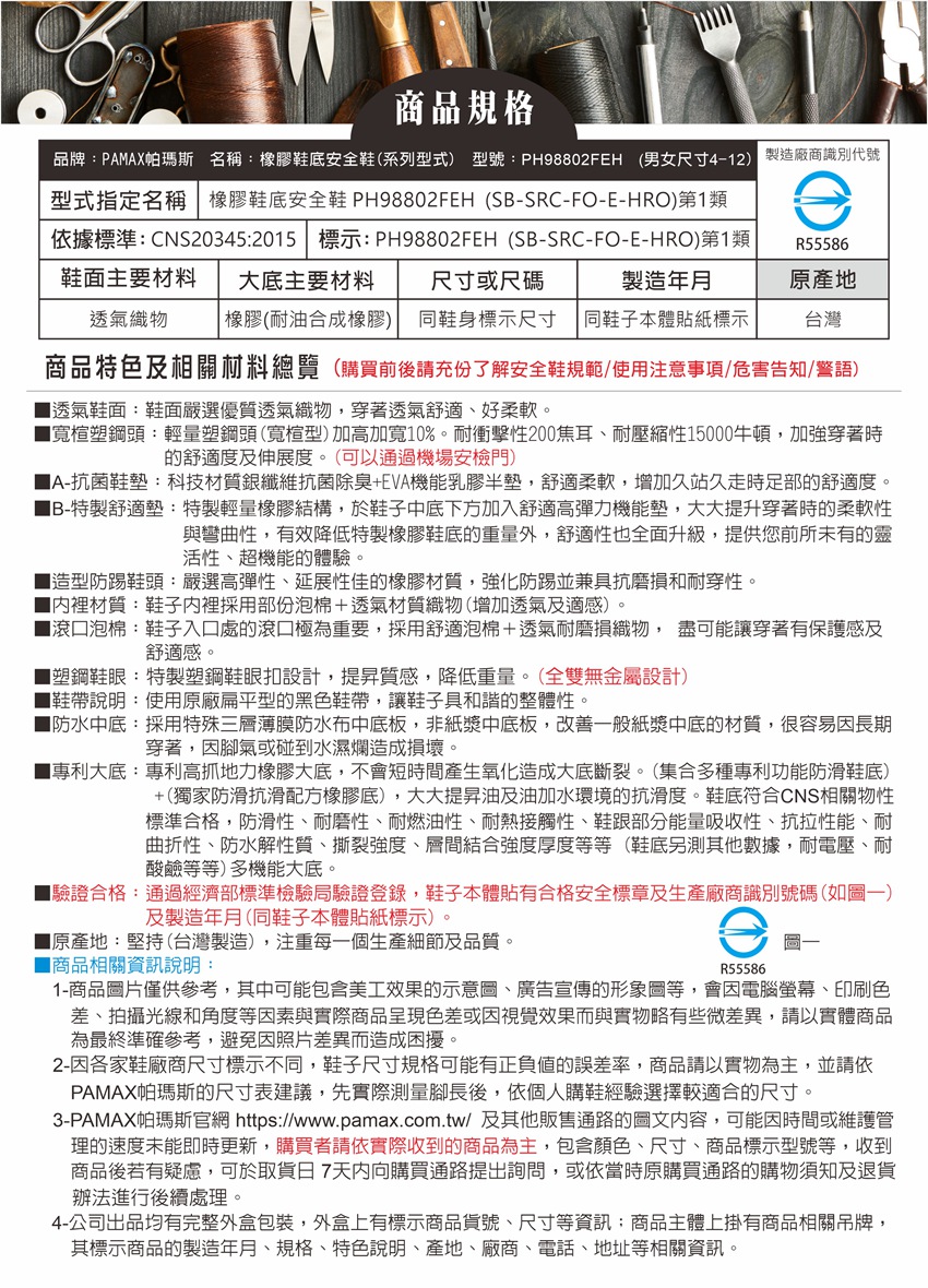 此工作安全鞋【通過經濟部標準檢驗局驗證登錄】依據標準【CNS20345:2015】,依法取得合格證書及合法銷售 購買PAMAX安全鞋依實際鞋子為主:PAMAX帕瑪斯官網https://www.pamax.com.tw/,網站圖片及資料或其他通路販售的資料,可能因時間及維護管理未能即時更新,購買者請依實際收到的安全鞋或鞋類為主,包含鞋子顏色,尺寸,商品標示,製造日期,鞋盒包裝,商品說明,產地,廠商,電話,地址,相關吊牌,依取得當時為主,請確認是否正確,收到商品後若有疑慮,可於取貨日7天内向購買通路提出詢問,或依當時原購買通路的購物須知及退貨辦法進行。
