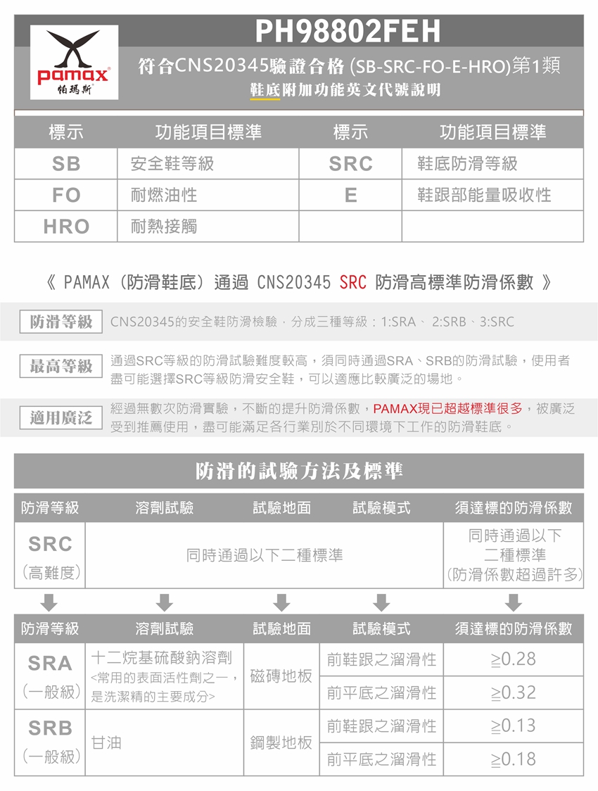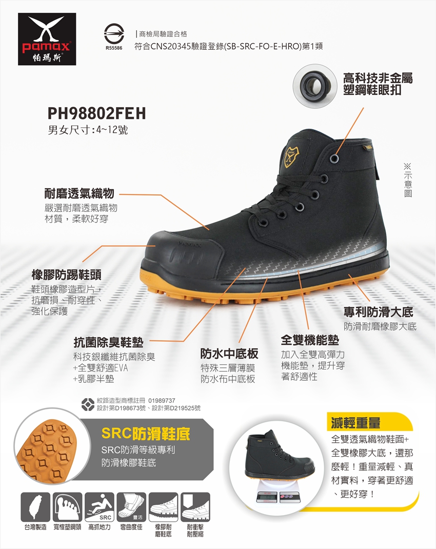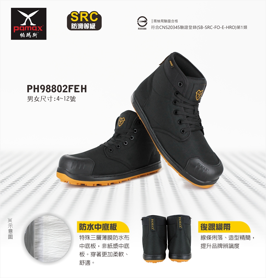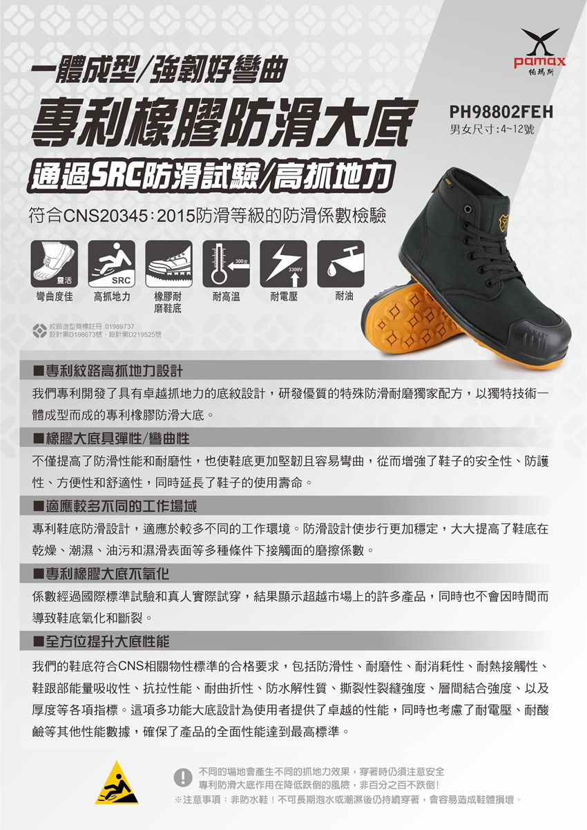 此工作安全鞋【通過經濟部標準檢驗局驗證登錄】依據標準【CNS20345:2015】,依法取得合格證書及合法銷售 購買PAMAX安全鞋依實際鞋子為主:PAMAX帕瑪斯官網https://www.pamax.com.tw/,網站圖片及資料或其他通路販售的資料,可能因時間及維護管理未能即時更新,購買者請依實際收到的安全鞋或鞋類為主,包含鞋子顏色,尺寸,商品標示,製造日期,鞋盒包裝,商品說明,產地,廠商,電話,地址,相關吊牌,依取得當時為主,請確認是否正確,收到商品後若有疑慮,可於取貨日7天内向購買通路提出詢問,或依當時原購買通路的購物須知及退貨辦法進行。